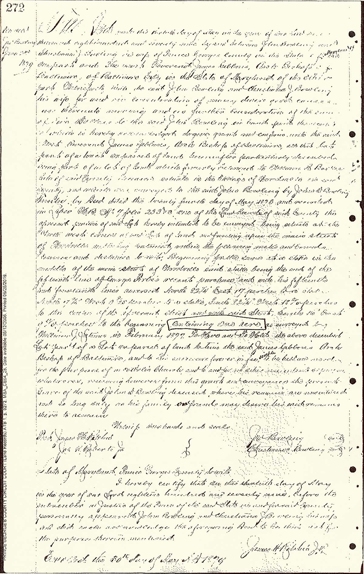 “This deed made the 30th day of May in the year of Our Lord 1879 by and between John Bowling and Christina J. Bowling, his wife, of Prince George’s County in the State of Maryland on the one part, and the Most Reverend James Gibbons, Archbishop of Baltimore City, in the State of Maryland, of the other part, Witness that the said John Bowling and his wife for and in consideration of many divers good causes as there unto moving and no further consideration of the sum of five dollars to said John Bowling in hand paid receipt of which is hereby acknowledged, do give grant and confirm unto said The Most Reverend James Gibbons, Archbishop of Baltimore, all that part or tract or parcel of land hereuntofore particularly described as part of a lot of land formerly belonging to William R. Burker, late of said County deceased, situated in the Village of Woodville in said County and which has conveyed to said John Bowling by John Dominic Bowling Trustee by deed the twenty-fourth of May 1873 and recorded in Liber HB, No. 7, folio 233, one of the land records of the said County and aforesaid portion of said lot hereby intended to be conveyed being situated on the northwest corner of said lot of land and fronting upon the main street of Woodville and being contained within the following meters and boards and courses and distances to wit: Beginning from said stake in the middle of the main street of Woodville said stake being end of 15 line of George Forbes’s recent purchase and with his 15 and 14 line reversed N.82 1/4 degrees East 17 perches to a stake N. 7 3/4˚, 9 8/25 perches to a stake, S. to 82 1/4 degrees W.18 2/10 perches to center of aforesaid street and with said street S. 16 degrees East 9 2/5 perches to the beginning, containing one acre as surveyed by William J. Latimer in February 1877. To have and To Hold the above-designated Lot part of lot or parcel of land—the said James Gibbons, Archbishop of Baltimore, and his successor forever in fee simple to be held and used for the purchase of a Catholic Church and to and for no other use intent or purpose whatsoever, reserving however from the grant and conveyance the present Grave of said John Dominic Bowling deceased where his remains are now interred and so long as his family and friends may desire his said remains there to remain.