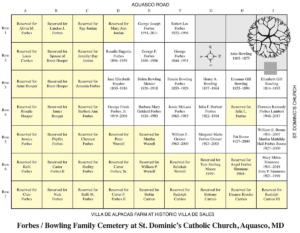 In 1879, St. Dominic’s Church and Cemetery were dedicated by James Cardinal Gibbons for the Bowling Family. Colonel Bowling gave this property to the Church with the stipulation that only members of the Bowling family, their descendants, and their spouses would be buried there. This tradition has continued until present time as is evidenced by the family names marked and the history of which persons have been allowed to be buried there (see early history article below). The small acreage would not accommodate many graves, but this was considered appropriate as not all family members may choose to be buried there. Around 1986, Colonel Bowling’s great-granddaughter and parishioner, Mittie Forbes Simmons, donated additional acreage from the adjacent Villa De Sales farm to accommodate more car parking at the church.