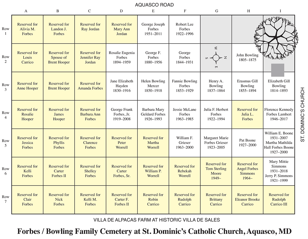 When Colonel Bowling’s daughter, Fannie Bowling Forbes, died in 1929, she was buried near her sister and parents. Her husband, George Forbes, an Episcopalian, died two years later and it was very doubtful that he could be buried next to her. His three surviving children, Mary Eleanor Forbes (Mrs. Charles Albert Bowling), Elizabeth Gill Forbes (Mrs. Edward George Edelen), and George Francis Forbes, all of whom were faithful Catholics finally received permission for his burial beside his dearly beloved wife. A granite tomb marks their graves.