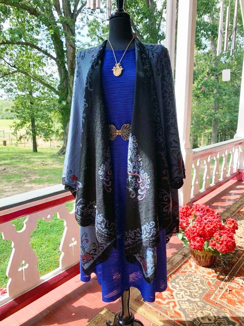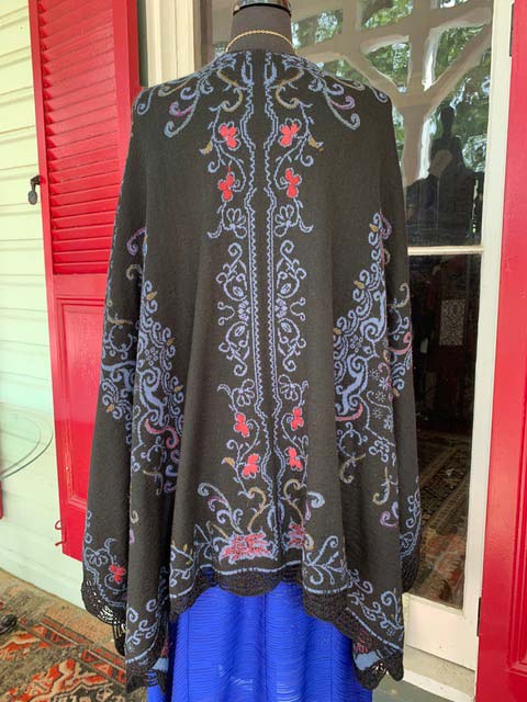 Reversible Alpaca Cape with embroidered appliqués. Primary color on one side, with the reverse on black on the other side. Hand wash or dry clean. One size fits all.