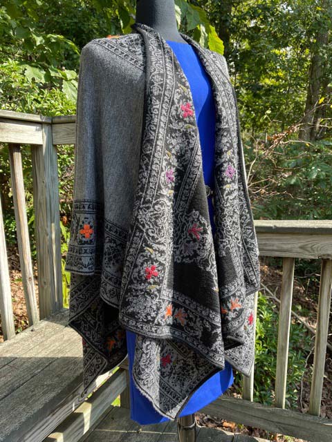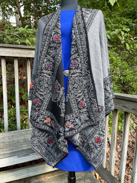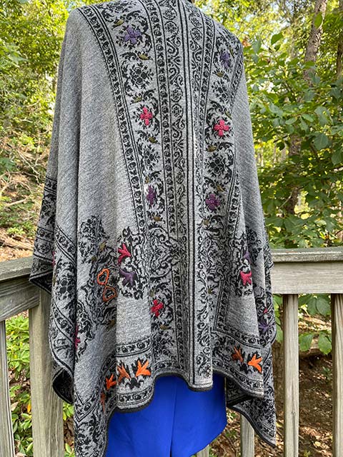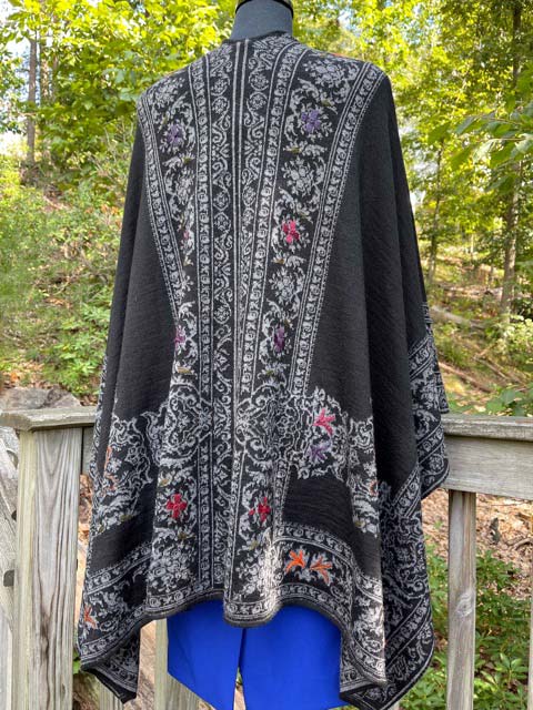 Reversible Alpaca Cape with embroidered appliqués. Primary color on one side, with the reverse on black on the other side. Hand wash or dry clean. One size fits all.